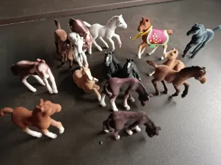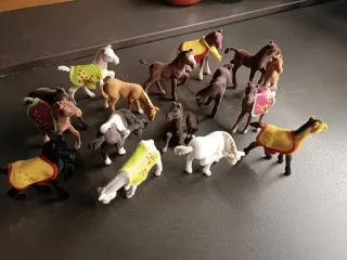 Set di 15 cavallini giocattolo, alcuni con accessori come coperte colorate. - Vari colori e design dei cavalli. - Coperte con fantasie decorative.