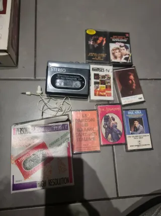era il mio e funziona a pile con le cassette rimaste e la cuffia. tutto quello che vedete in foto