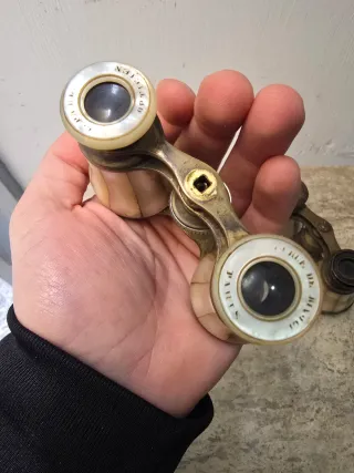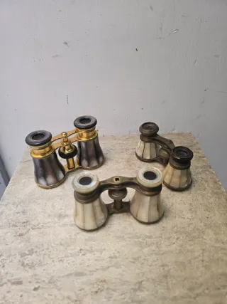 Set di binocoli da teatro antichi, perfetti per collezionisti o amanti del vintage. Design elegante con finiture in madreperla, osso e metallo dorato. Ideali per ammirare dettagli a distanza. Condizioni come da foto.