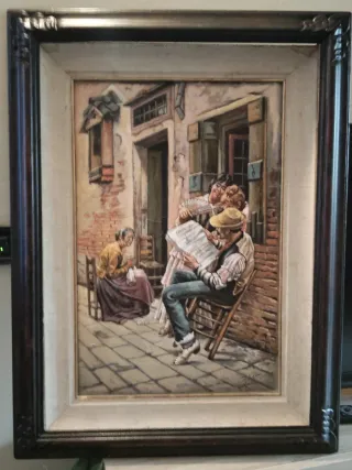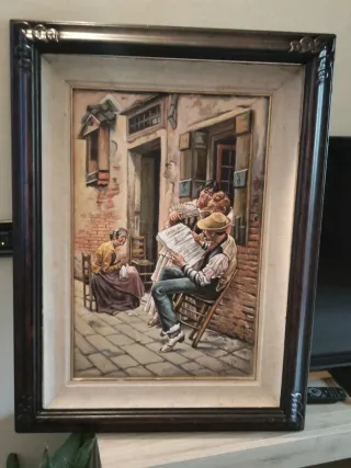 Dipinto a olio su cartone raffigurante una scena di vita quotidiana ,misura 40x60 in cornice 60x80,firmato in basso come da foto. - Soggetto: Lettura del quotidiano - Tecnica: Olio su cartone