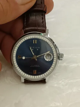 Orologio da polso Orion con carica manuale. - Quadrante blu. - Datario. - Movimento Swiss Made. - 17 rubini. Perfettamente funzionante diametro cassa 37 escluso corona