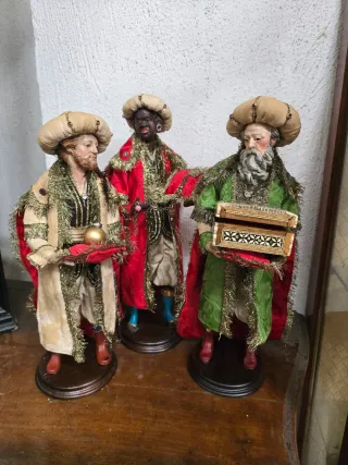 Scenetta raffigurante i Re Magi, ideali per presepi o scenette autonome. Origine italiana, epoca novecento. Figure interamente in terracotta con occhi di cristallo e abiti tradizionali. Ogni Re Mago porta un dono. Base di supporto in legno inclusa per ogni figura. Dimensioni: Altezza 44cm Condizioni come da foto.