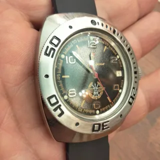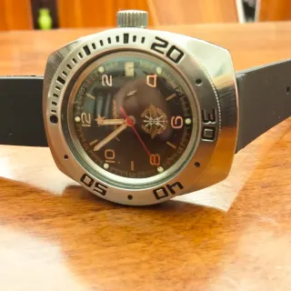 Orologio Vostok Amphibia meccanico con movimento 2414 A a 17 rubini, personalizzato. - Cassa 090 anni 70 lappata e lucidata a mano. - Movimento meccanico a 17 rubini PERFETTAMENTE funzionante. - Quadrante Vostok Space Force Komandirsky. - Bezel custom satinato a mano. - Cinturino in gomma nero. Pezzo Unico! Lievissimi segni di usura come da foto