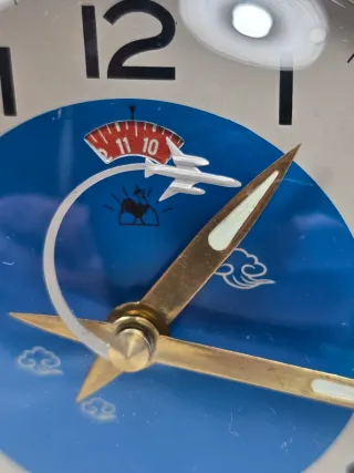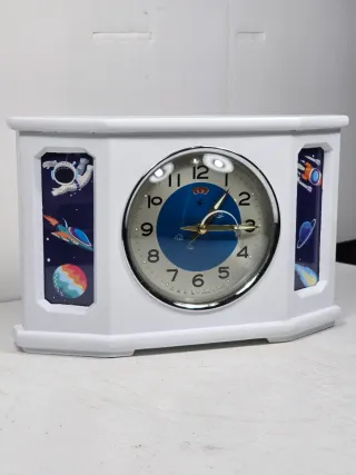 orologio da tavolo vintage meccanico con un tema spaziale, anni '70 definiti "space age", presentano un desian distintivo con animazioni, come quella de razzo come lancetta dei secondi, la meccanica è funzionante ha la funzione sveglia la cassa è in legno laccato ed ha piccole imperfezioni o segni poco visibili (quardare foto) - Decorazioni a tema spaziale sui lati. - Quadrante rotondo con numeri chiari. - Cassa bianca.