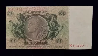 Banconota tedesca da 50 Reichsmark emessa nel 1933. - Serie X, numero di serie 8139911. - Emessa sulla base della legge bancaria del 30 agosto 1924. - Data di emissione: Berlino, 30 marzo 1933. - Presenta il ritratto di un uomo con occhiali e capelli bianchi. - Valore nominale: 50.