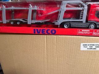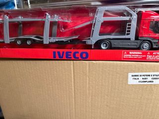 Bisarca Iveco Stralis 540 in red. This is a toy truck. - Brand: Iveco - Model: Stralis 540 - Type: Bisarca (car carrier truck) - Color: Red - Includes warning labels for choking hazard.