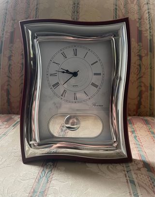 Elegante orologio da tavolo con cornice in metallo lucido e inserti in legno scuro. Il quadrante presenta numeri romani e un pendolo decorativo. - Cornice con design ondulato. - Quadrante con numeri romani. - Pendolo oscillante visibile.