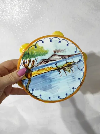 Bellissimo cimelio artigianale, dipinto a mano con una scena Vesuvio. - Raffigura io Vesuvio con mare e alberi. - Bordo decorato con motivi blu e arancioni. - Dettagli colorati e vivaci.