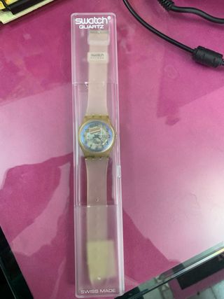 Orologio Swatch originale, modello Quartz. - Cassa e cinturino in plastica traslucida. - Quadrante con numeri arabi e dettagli grafici. - Chiusura a fibbia. - Swiss Made.