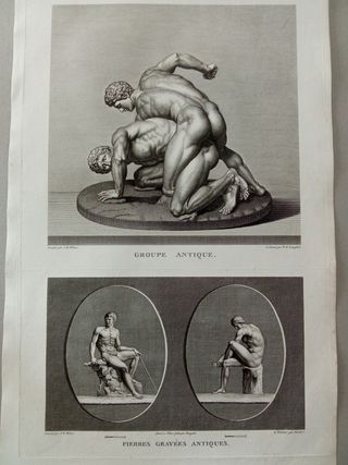 Incisione 1800 MONGEZ - I Lottatori (Groupe Antique) e Atleti - Wicar incisione originale su rame (acquaforte/bulino) risalente ai primi del XIX secolo, parte della serie dedicata ai tesori della Galleria degli Uffizi e di Palazzo Pitti a Firenze, curata da A. Mongez Autore: Antoine Mongez (testi), Jean-Baptiste Wicar (disegni) Incisione su rame (Acquaforte) Inizio XIX Secolo Soggetto: Il celebre gruppo scultoreo dei Lottatori (Uffizi/Pitti). In basso, due gemme con atleti o eroi in riposo (uno richiama l'Atleta di Lisippo) Incisore: Masquelier (sopra), Bertaux/Pauquet (sotto) 32,5 x 51,5 cm ca Carta vergata pesante LOEB 04 03 2026