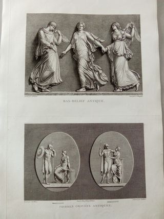 incisione originale su rame (acquaforte/bulino), parte della serie dedicata ai tesori della Galleria degli Uffizi e di Palazzo Pitti a Firenze, curata da A. Mongez Autore: Antoine Mongez (testi), Jean-Baptiste Wicar (disegni) Incisione su rame (Acquaforte) Inizio XIX Secolo Soggetto: In alto, bassorilievo raffigurante le Tre Grazie (Aglaia, Eufrosine e Talia). In basso, due "Pierres Gravées" (gemme) con figure di guerrieri mitologici, probabilmente Marte o eroi omerici Disegnato da J.B. Wicar. Incisore del bassorilievo: Masquelier. Incisore delle gemme: Bertaux (acquaforte) e Dauban (bulino) 32,5 x 51,5 cm LOEB 04 03 2026