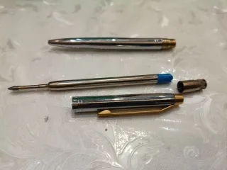 Penna Omas in metallo lucido. - Corpo della penna in metallo lucido. - Clip dorata. - Refill con cappuccio blu.