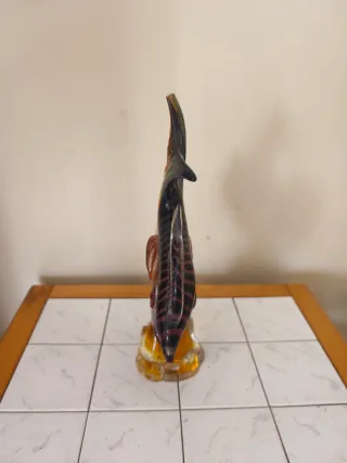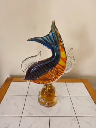 Splendida scultura in vetro soffiato raffigurante un pesce in alcuni punti mancano pezzettini ma non ne influiscono la bellezza alt. 31 x 20 cm - Realizzata in vetro colorato con sfumature vivaci. - Base in vetro trasparente. - Design artistico e dettagliato.