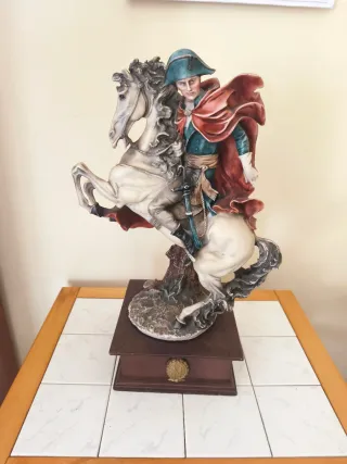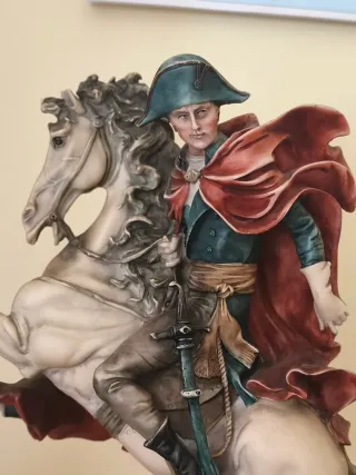 Raffinata scultura in resina che raffigura Napoleone Bonaparte a cavallo, con mantello svolazzante e cappello iconico. - Dettagli finemente lavorati. - Base decorativa inclusa.
