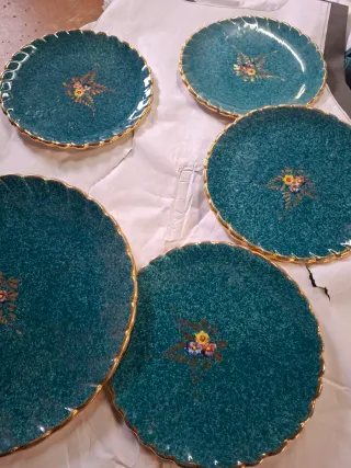 Set di cinque piatti in ceramica con decorazioni floreali e bordo dorato. Quattro piatti sono di piccole dimensioni e uno è più grande. - Decorazione floreale dipinta a mano. - Bordo ondulato con finitura oro. - Colore principale verde petrolio misura il grande 26x26 I piccoli 19x19