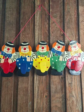 Un simpatico appendi abiti vintage, realizzato in legno e dipinto a mano. - Cinque clown colorati. - Dettagli dipinti a mano misura 36x17.