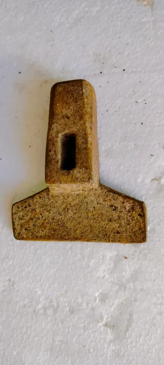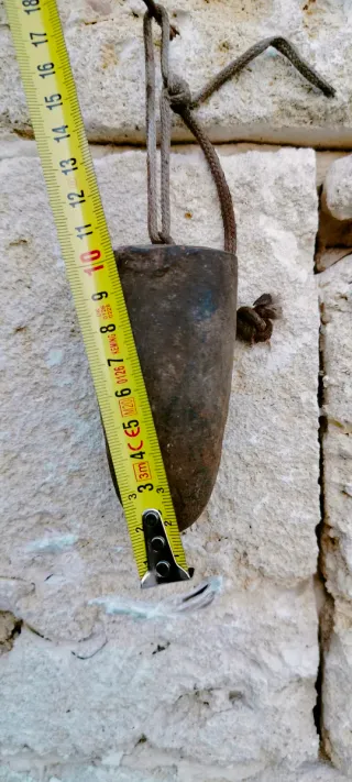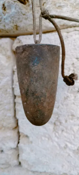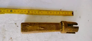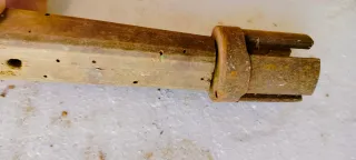 Questo è un attrezzo antico, realizzato in legno e con inserti in metallo. - Materiale: legno e metallo. - Presenta segni del tempo e fori. - Anello metallico decorativo.