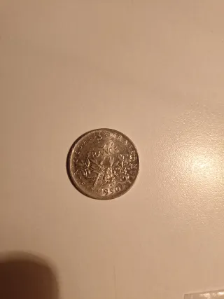 Moneta da 5 Franchi Francesi, coniata nel 1990. - Dettaglio Liberté Egalité Fraternité. - Raffigurazione di rami e foglie.