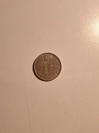 Moneta da 5 franchi del Belgio. Presenta una corona e un fascio di spighe. - Valore: 5 Franchi - Paese: Belgio - Dritto: Corona e fascio di spighe - Rovescio: Valore e anno
