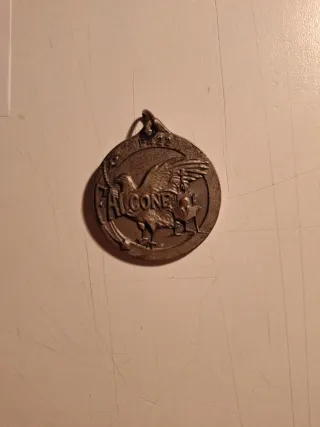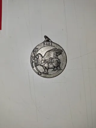 Medaglia da collezione con l'effigie di un falco e la scritta Falconer - F422. - Raffigurato un aquila. - Raffigurato scena di battaglia con un motto in latino. - Materiale bronzo.