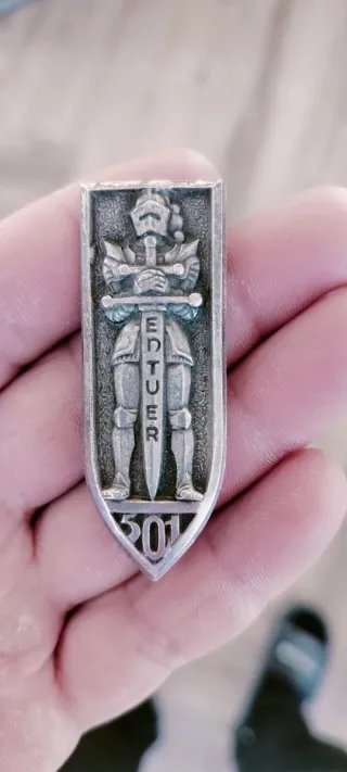 Distintivo militare vintage con figura di cavaliere. - Figura di cavaliere in armatura. - Spada con iscrizione ECTUER.Distintivo del 501 reggimento carri da combattimento francese