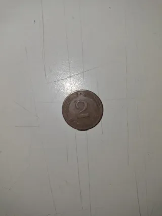 Moneta tedesca da 2 Pfennig. - Dettaglio del numero 2. - Presenta una corona di foglie ai lati.