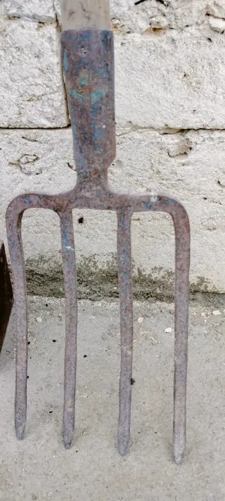 Attrezzo agricolo vintage, ideale per lavori in giardino o piccole coltivazioni. - Struttura in metallo arrugginito. - Manico biforcuto.
