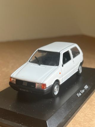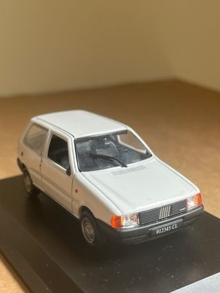 Modellino Fiat Uno del 1983. Ottime condizioni generali, eccetto per la mancanza degli specchietti. - Colore bianco. - Base espositiva nera con scritta Fiat Uno - 1983. - Targa 012345 CL.