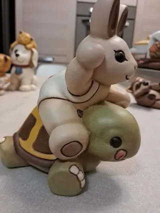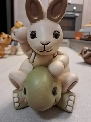 Deliziosa statuetta Thun raffigurante una tartaruga con una lepre seduta sopra. - Design unico e colorato. - Perfetta per collezionisti.