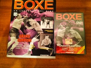 DVD + opuscolo allegato, Boxe "La leggenda del ring- Grandi campioni". Sono elencati "Grandi Campioni" e specifici incontri come Johnson-Moran (1914), Dempsey-Sharkey (1927) e Louis-Galento (1939). Commento di Rino Tomasi. Audio stereo, durata 80 Min. Edizione De Agostini. DVD ancora perfettamente sigillato