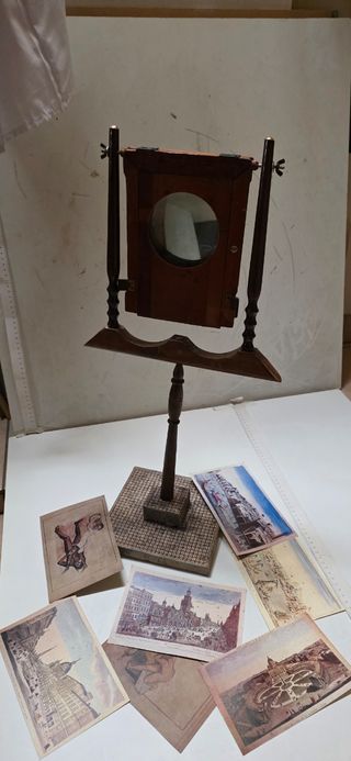 Zograscope molto bello tutto in legno tramite un sistema di specchio e lente riflette e ingrandisce le immagini appositamente create per vederle con uno splendido senso di profondità. Veniva anche usato per i ritocchi sulle immagini avendo le mani libere .lo specchio è la lente sono basculanti per posizionare lo strumento nella giusta posizione in funzione dell immagine Da,notare che una immagine e bifacciale quindi doppio .veramente un apparecchio rarissimo e molto bello Venduto come acquistato, non conosco il periodo di costruzione, guardate le foto e se avete bisogno di chiarimenti sono a disposizione