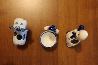 Set di tre graziose decorazioni in ceramica, perfette per aggiungere un tocco di allegria alla tavola come porta stuzzicadenti e portauovo. Segnalo piccola scheggiatura sulla mucca, vedi ultima foto, ma non si nota molto. Guarda i miei annunci, se acquisti altri oggetti hai lo sconto e posso fare un'unica spedizione