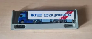 Modellino di camion con rimorchio Waagan Transport AS. - Cabina blu. - Rimorchio bianco con scritte. - Dettagli rossi sul rimorchio.