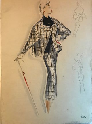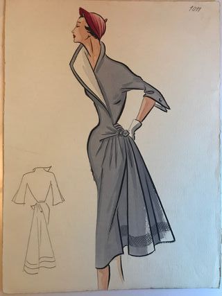 Tre magnifici bozzetti di moda anni '50 originali, su cartoncino.
