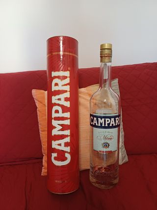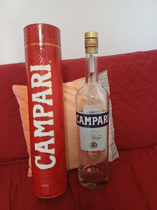 Vendo bottiglia di Campari con la sua confezione originale. La bottiglia è vuota. - Bottiglia di vetro trasparente. - Confezione cilindrica di cartone rosso. Da 3 litri
