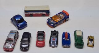 Set di modellini di veicoli assortiti, tra cui auto sportive, un'auto blu e un bus. - Modellino di bus AIRPORT BUS. - Auto sportiva blu con spoiler arancione. - Auto sportiva blu. - Auto da corsa argentata con scritte. - Auto nera CARABINIERI. - Auto rossa. - Auto nera con design futuristico. - Auto blu con pistone rosso. - Auto verde. - Auto gialla da corsa.