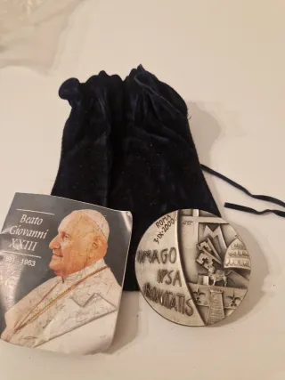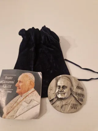 Medaglia commemorativa di Papa Giovanni XXIII. - Dritto: Ritratto di Papa Giovanni XXIII con iscrizione Beato Giovanni XXIII 1881-1963. - Rovescio: Immagine con croce, chiavi, stemma papale e iscrizione IMAGO IPSA BONITATIS ROMA 3-IX-2000. - Include sacchetto in velluto blu.