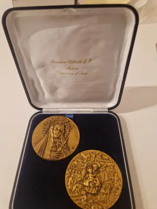 Set di due medaglie commemorative, presentate nella loro scatola originale. - Medaglia con effigie di Madonna con corona di fiori e cuore trafitto. - Medaglia con scena sacra raffigurante San Antonio con Bambino e fedeli. - Scritta Damiano Colombo & F. Milano Coniazione d'Arte all'interno della scatola.