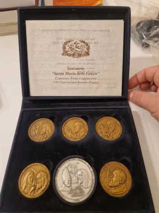 Set di medaglie commemorative dedicate al Giubileo e a Padre Pio, provenienti dal Santuario di Santa Maria delle Grazie. - Raffigurano Padre Pio e altre figure religiose. - Provenienti dal Convento Frati Cappuccini di San Giovanni Rotondo (Foggia).