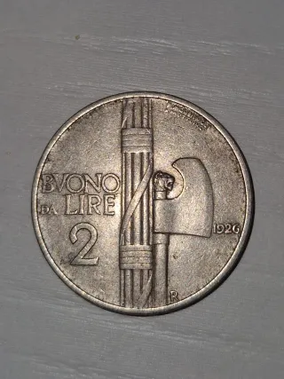 Moneta da 2 Lire del 1926. - Dritto: Fascio littorio e ascia. - Rovescio: Figura femminile con spighe di grano. - Anno: 1926 - Zecca: R