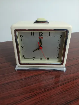 Sveglia da tavolo dal design retrò, tipico degli anni '70. La sua struttura è in plastica color crema con finiture cromate lucide. - Forma squadrata con base e cornice metallica. - Quadrante analogico con numeri neri. - Lancette rosse per ore e minuti. - Pulsante superiore per la suoneria.