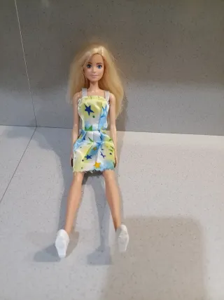 Bambola Barbie con un grazioso vestito. - Vestito giallo e blu con stampa di stelle. - Scarpe bianche incluse.