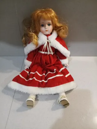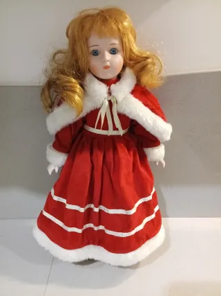 Bambola in ceramica con un grazioso vestito a tema natalizio. - Vestito rosso con bordi bianchi. - Cappottino bianco con pelliccia. - Dettagli sul vestito a righe bianche.