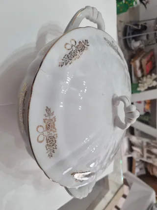 Elegante zuppiera vintage Laveno degli anni '50, con un raffinato decoro floreale in oro. - Design classico e intramontabile. - Manico decorato. - Bordo ondulato con finitura dorata.