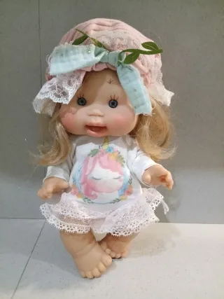 Bambola da collezione con un grazioso cappellino. - Cappellino rosa con dettagli in pizzo e fiocco. - Vestito bianco con stampa di unicorno. - Dettagli in pizzo sull'orlo del vestito.