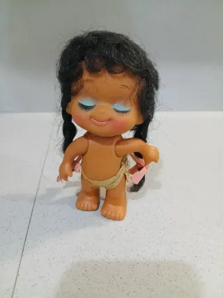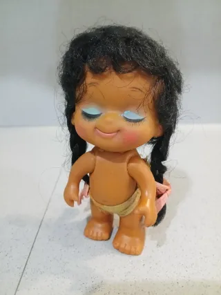 Bambola vintage degli anni '80, con capelli neri e occhi azzurri. - Capelli neri raccolti in due trecce. - Guance rosse. - Indossa un pannolino. - Dettagli in rosa sui fianchi.