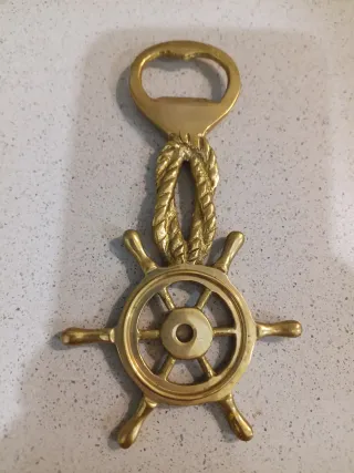Apribottiglie in ottone con design nautico. - Forma di timone di nave. - Dettaglio di corda intrecciata. - Materiale: ottone.