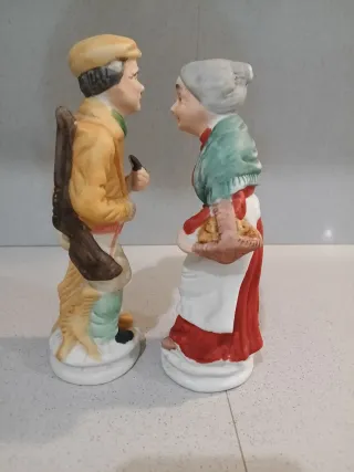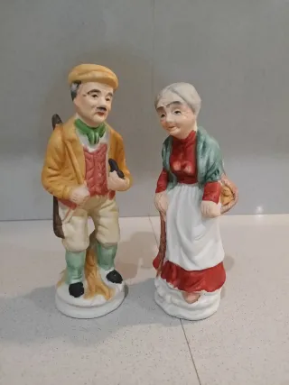 Deliziosa coppia di statuette in porcellana raffiguranti una coppia di anziani. - Realizzate in porcellana finemente dettagliata. - Rappresentano un uomo con cappello e giacca e una donna con scialle.