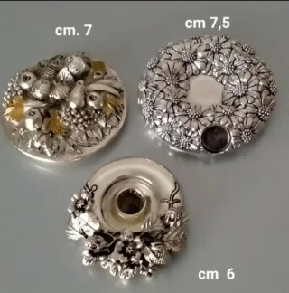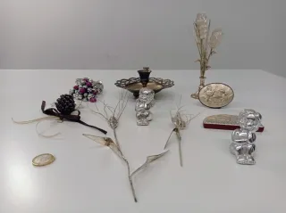 Lotto di oggetti decorativi in laminato d'argento, perfetti per aggiungere un tocco di eleganza - euro 4 CAD. - Set di elementi con decorazioni floreali e fruttate. - Design dettagliato e raffinato. - Ideali come soprammobili o elementi decorativi.