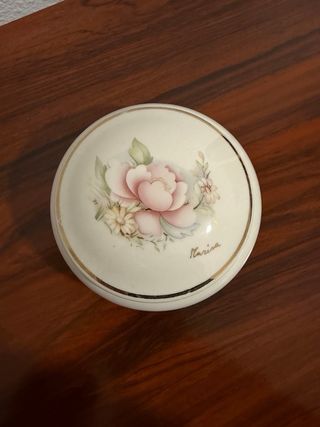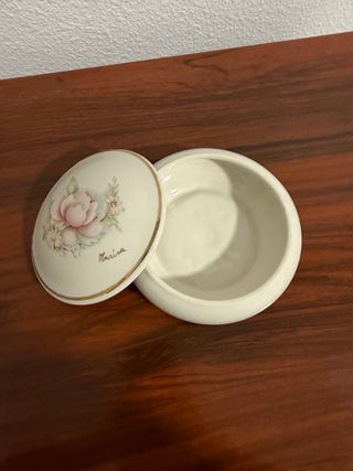 Bella scatola di oggetti vintage con un delicato design floreale e un bordo dorato. - Coperchio decorato con fiori e il nome Marina. - Bordo dorato sul coperchio e sulla base. - Materiale in ceramica o porcellana.